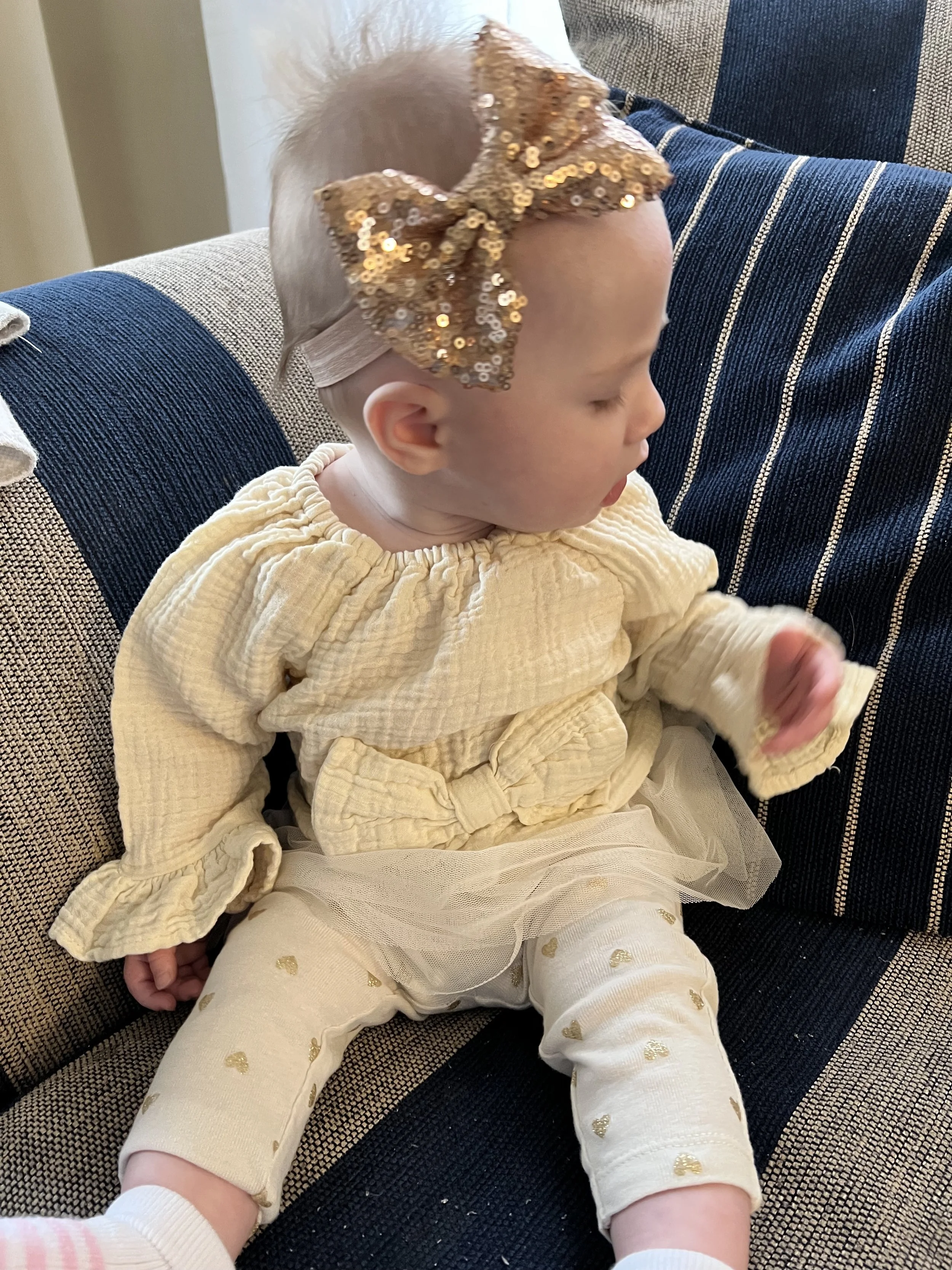 At her 6-month checkup, she was weighing 15lbs, 9 oz. She was all smiles and giggles until she had to get her shots. ☹️ Thankfully, the tears were short-lived and she was back to her happy self in no time. This month Lyla got really comfortable with moving her body. She tried sitting up by herself, rolled over from her back to tummy, wiggled out of her swing at daycare, and loves arching her back when going into the car seat. So I think it’s safe to say she still isn’t a fan of going into the car seat. I will say it’s slowly getting better though! We’ve learned that show tunes seem to do the trick (Are you going in the car, car, car, and go zoom, zoom, zoom? ). The daycare ladies say Lyla’s got abs of steel because every time she has tried to sit up by herself she lifts her head and feet off the floor. Maybe I should hire her as my personal trainer! 😉 She also has really started to enjoy jumping on her legs. Our girl just loves to move!