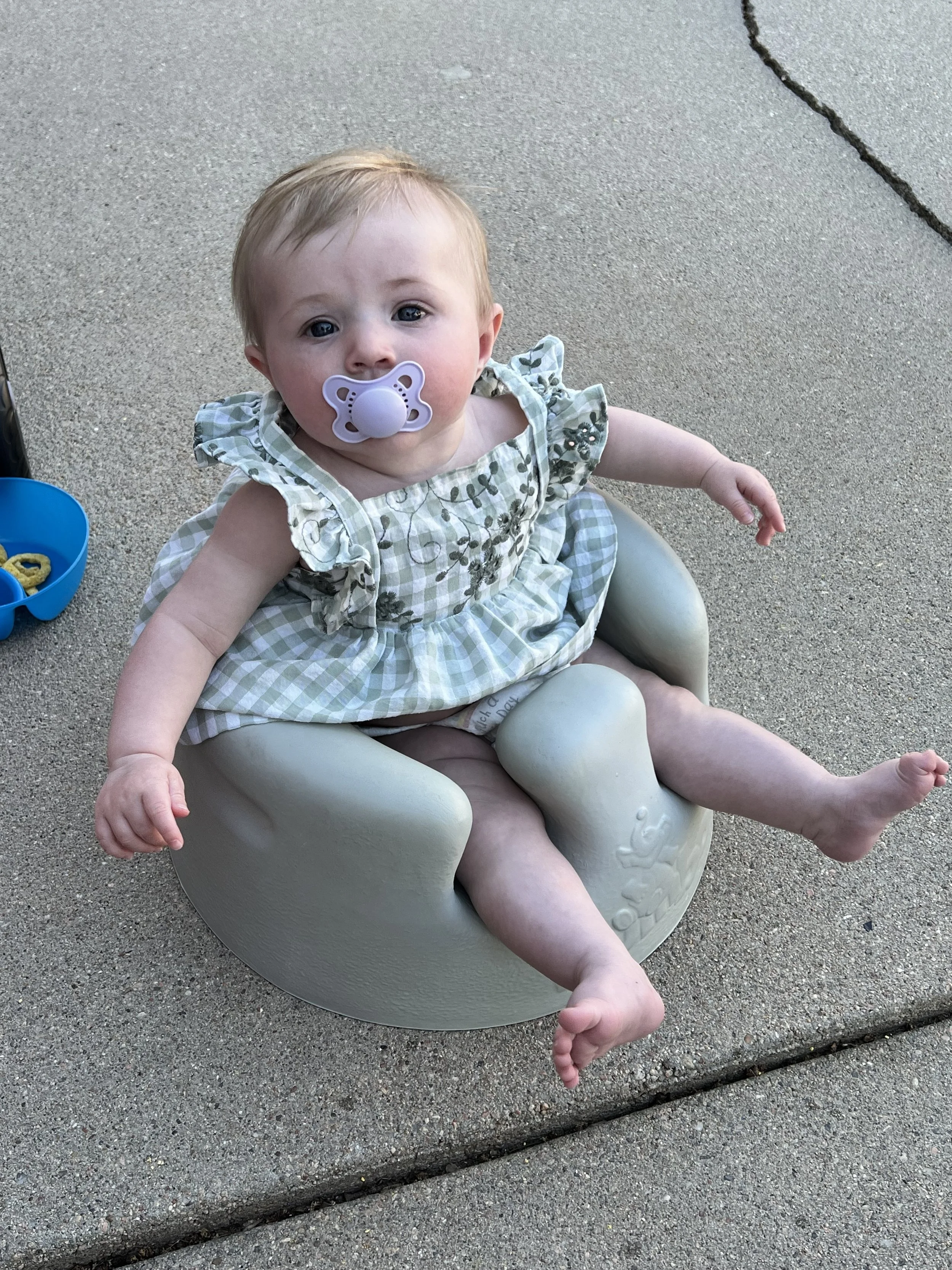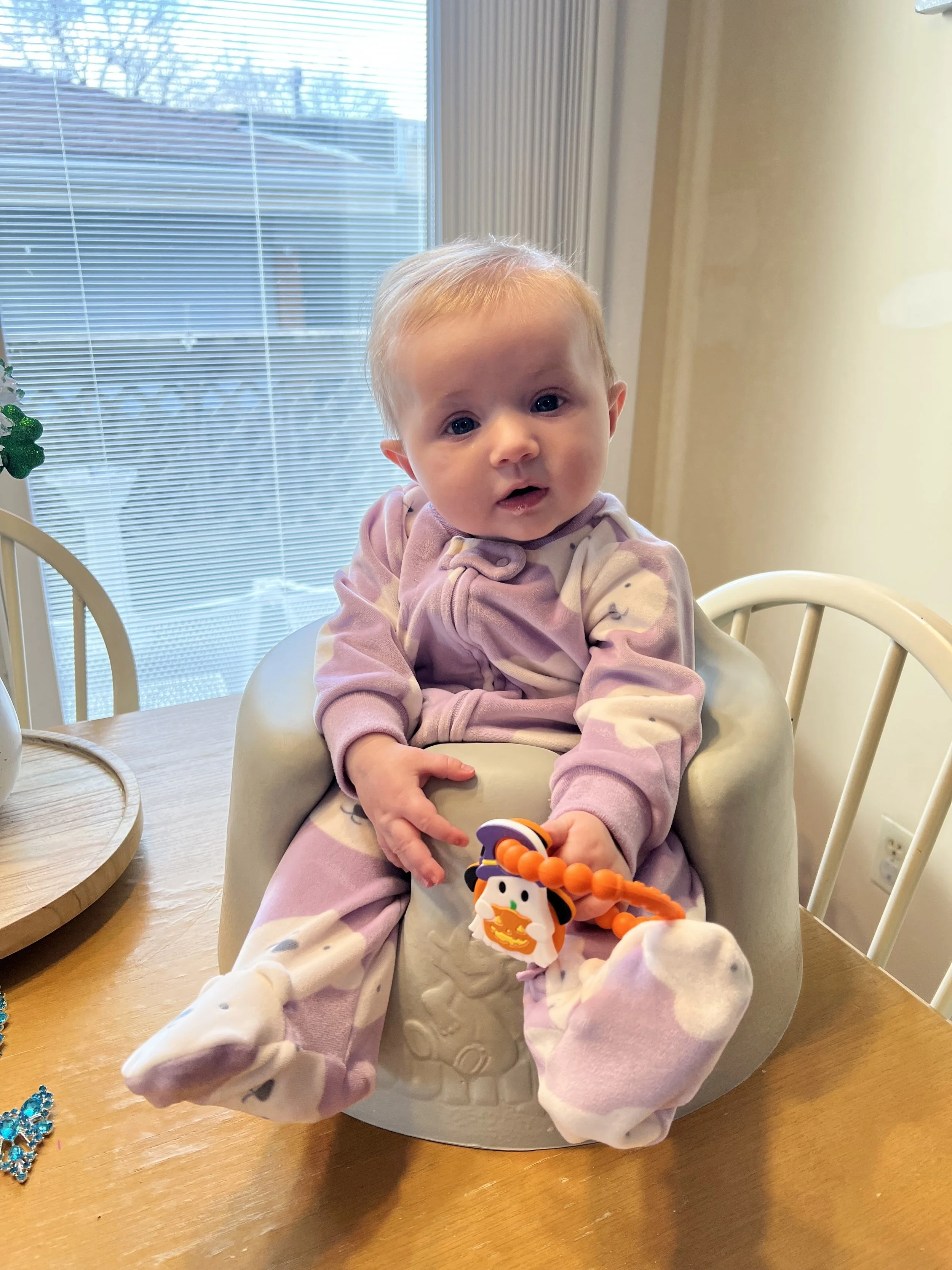 Anyway, I have so much to update you on, so let’s dive in. First, Josie is growing like a weed! At her six-month checkup, she weighed 15 pounds and was 26 inches tall. Her appetite has been increasing, and we recently started her on solids. Daycare gave her a Cheerio, and she handled it like a champ. Since we started integrating solids, we’ve been working on getting her to sit in her highchair at dinner with us and on learning how to pray.
