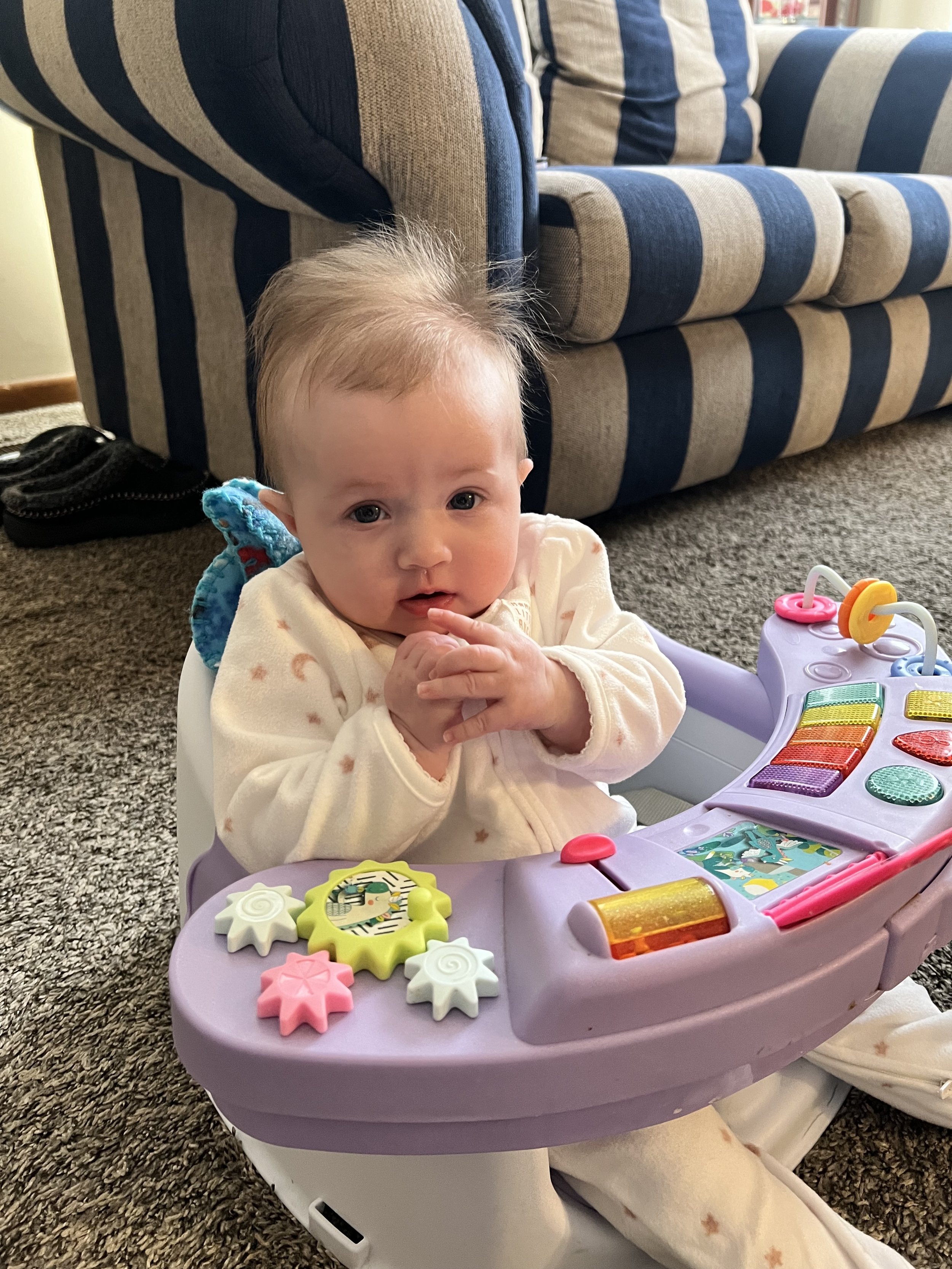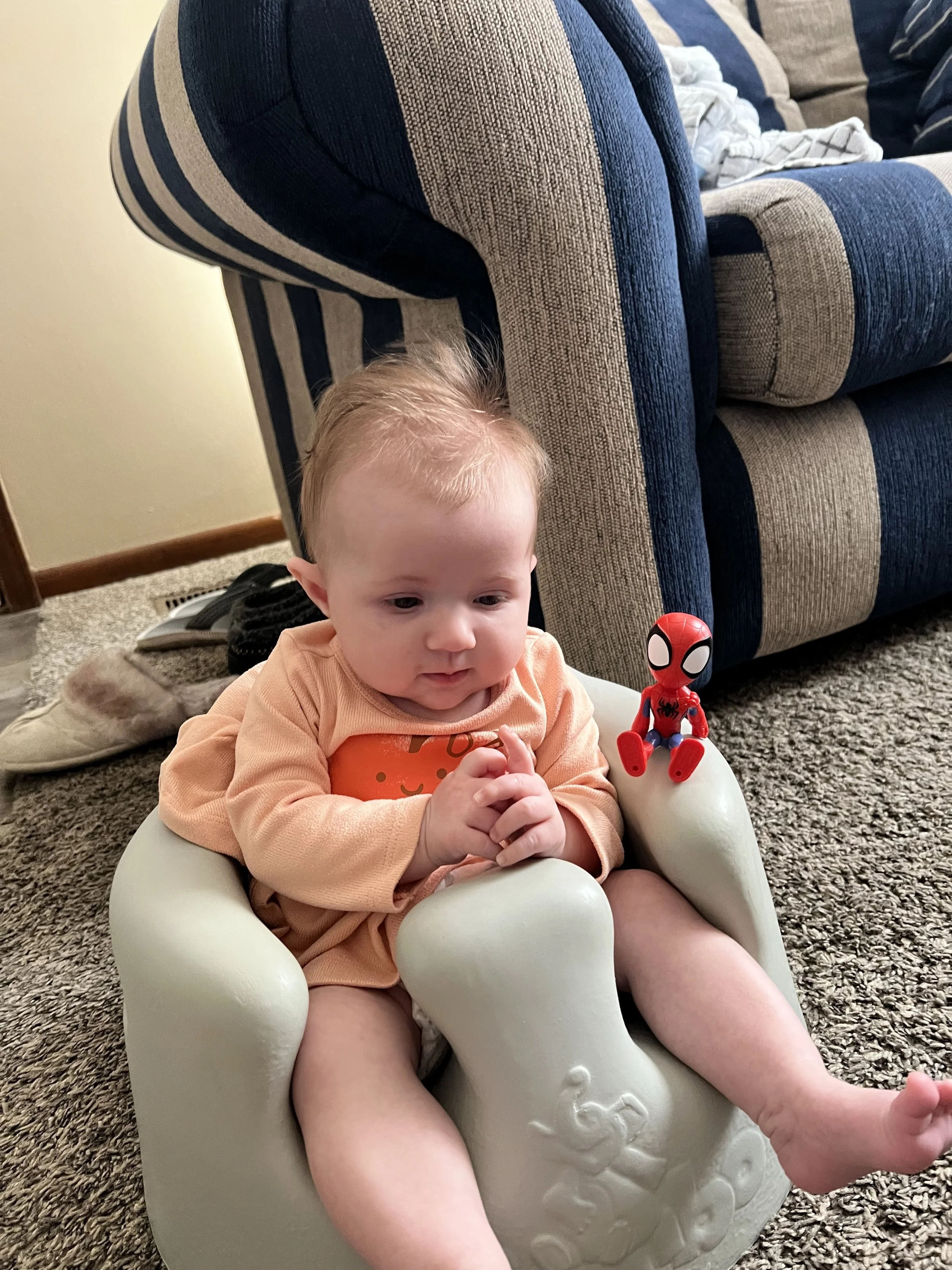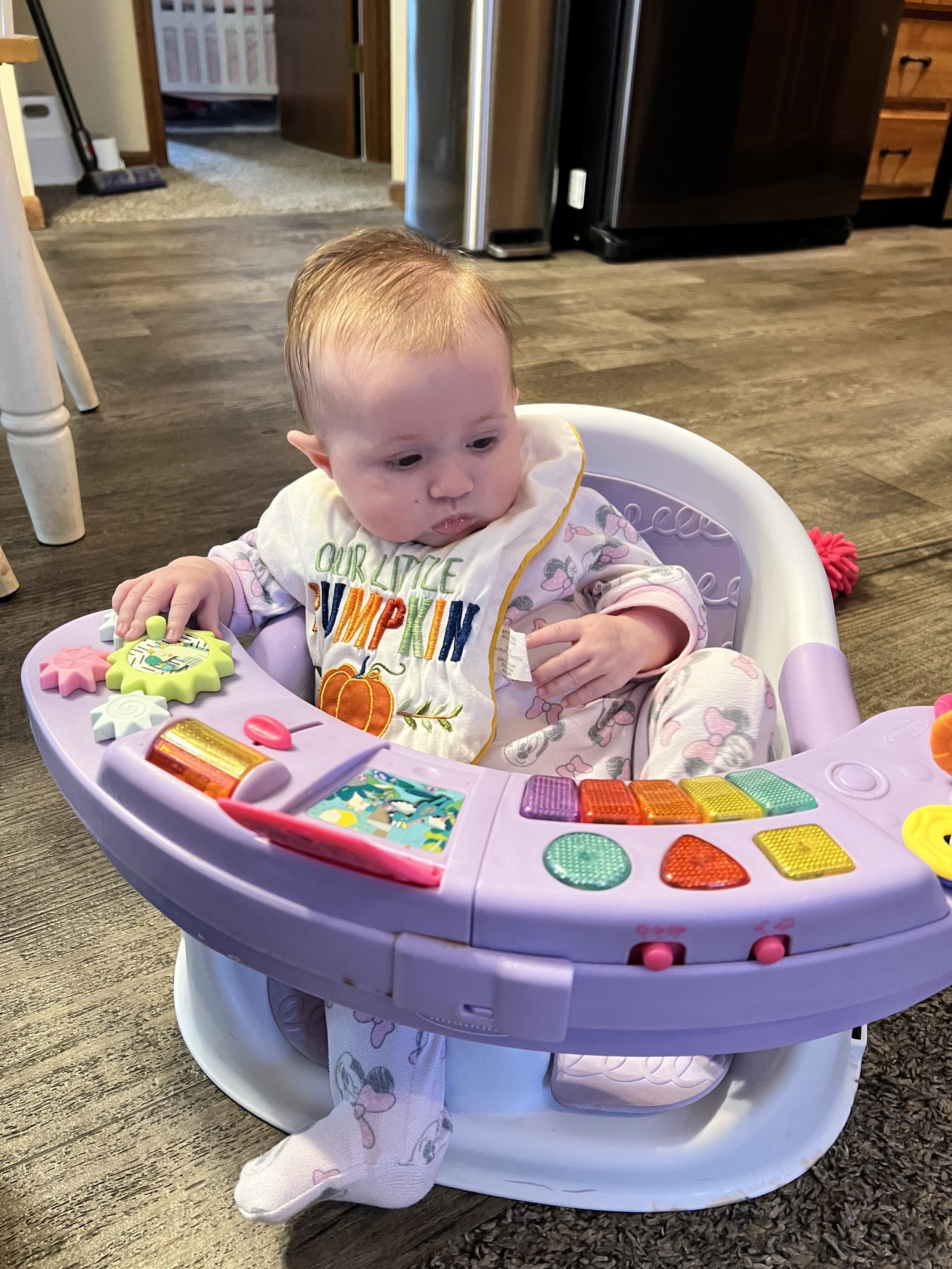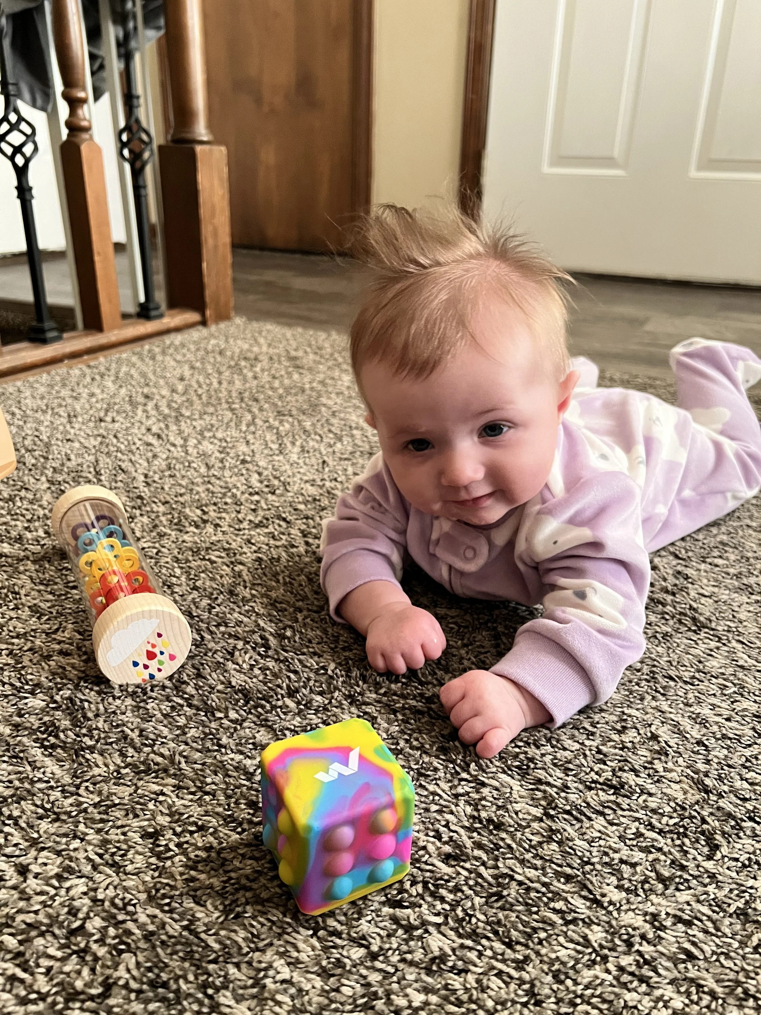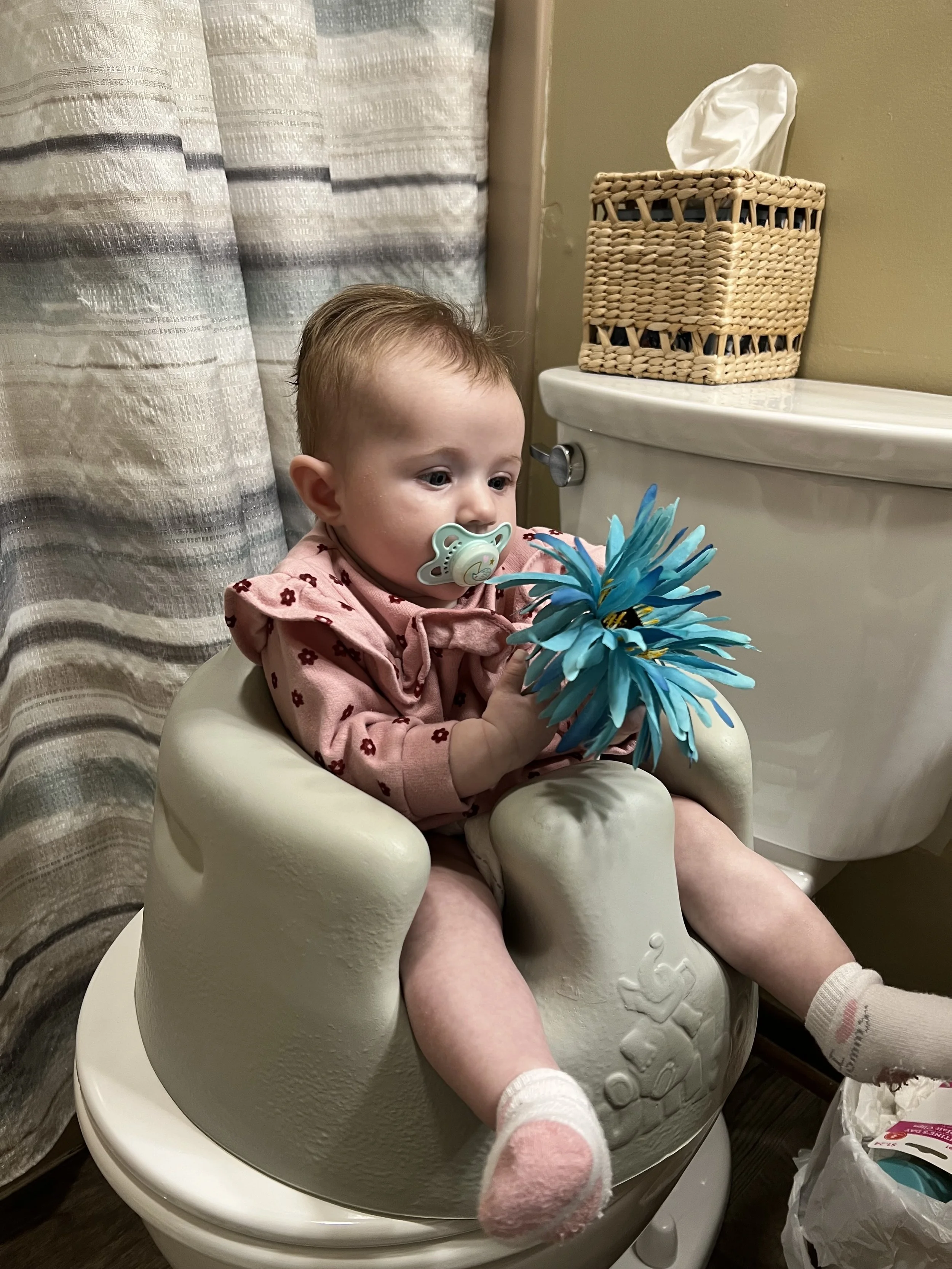Some of her favorite things at the moment are putting her hands in her mouth. She almost prefers that over her binky. She also loves playing with this sensory toy that has strings for her to pull on. Her grip is getting stronger, so it may not be as easy for Lyla to take toys away from her LOL. Something she’s not a big fan of is constipation, but can you blame the girl? We notice it tends to happen more when she gets sick because her feedings decrease. Poor girl went about a week and a half before there was any relief. We experienced this once with Lyla when she was a baby, but it never went that long. To help move things along for Jose, we diluted apple juice with water.