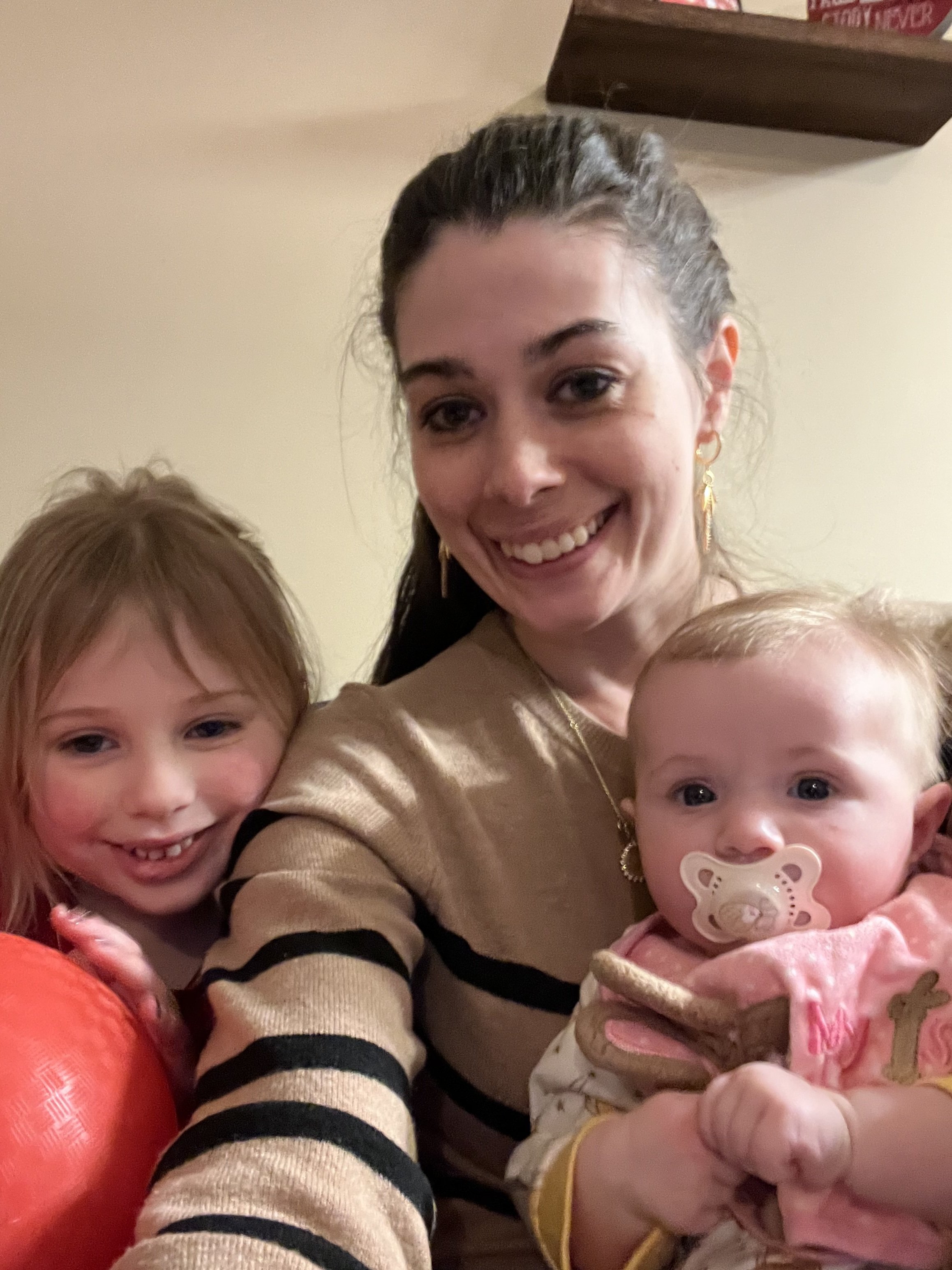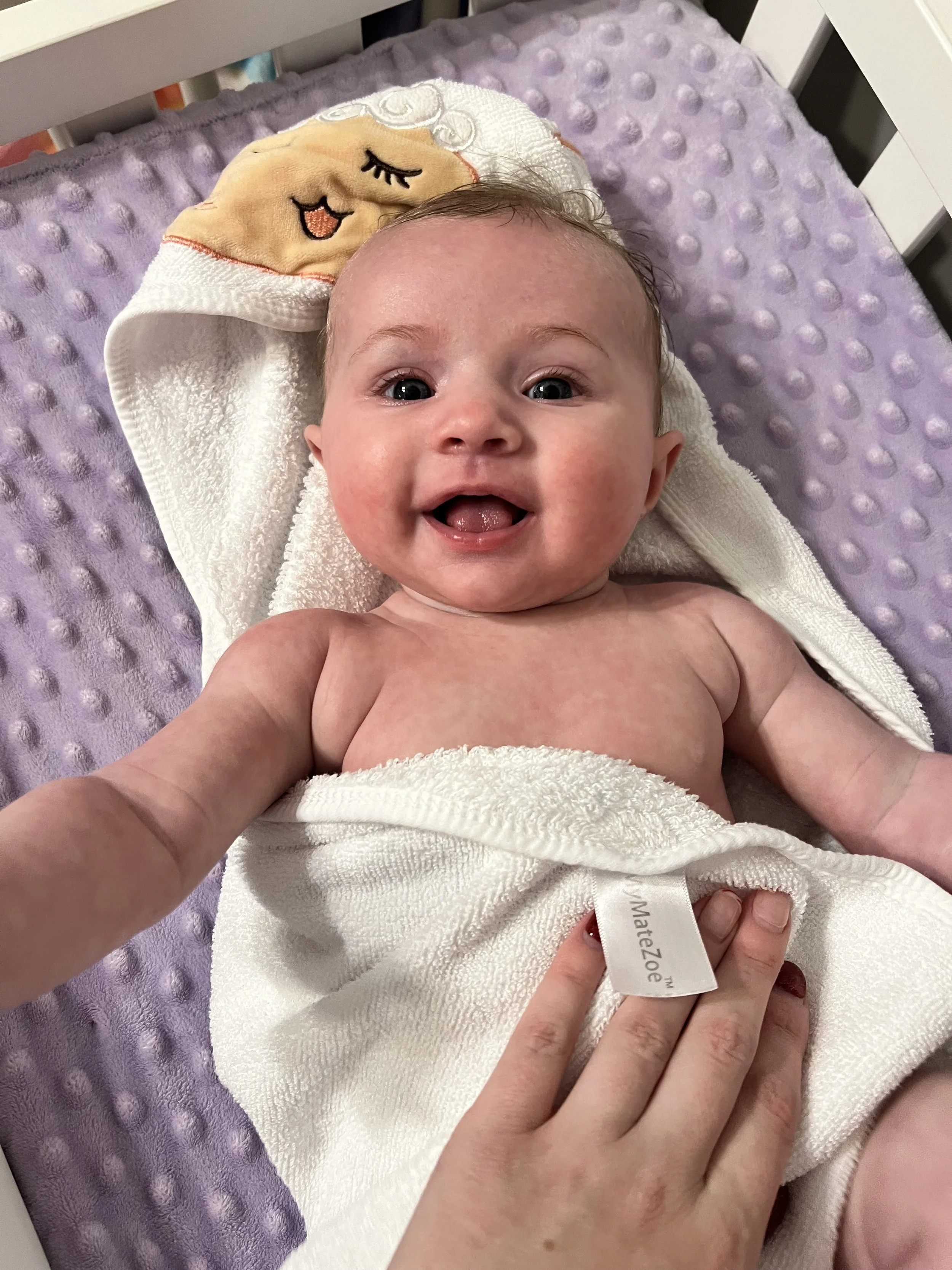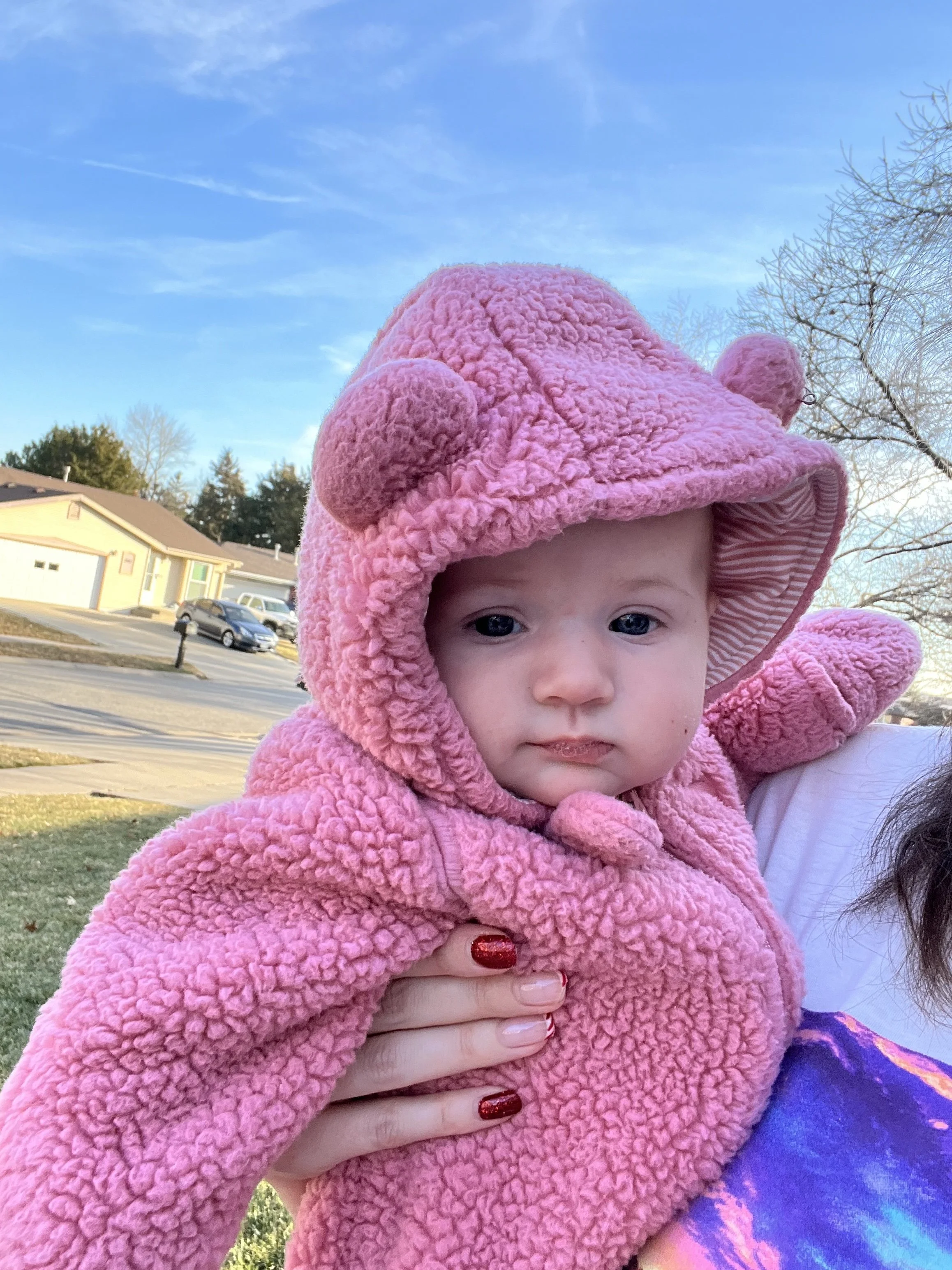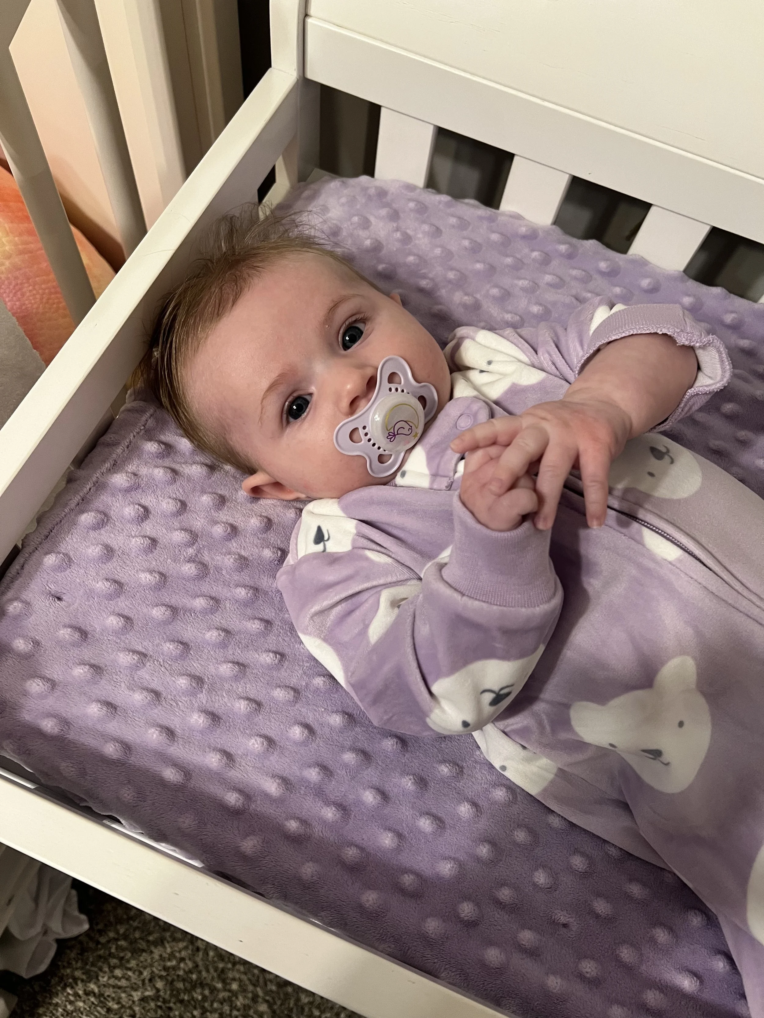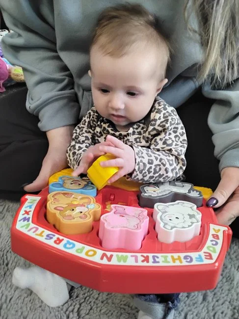 Some of her favorite things at the moment are putting her hands in her mouth. She almost prefers that over her binky. She also loves playing with this sensory toy that has strings for her to pull on. Her grip is getting stronger, so it may not be as easy for Lyla to take toys away from her LOL. Something she’s not a big fan of is constipation, but can you blame the girl? We notice it tends to happen more when she gets sick because her feedings decrease. Poor girl went about a week and a half before there was any relief. We experienced this once with Lyla when she was a baby, but it never went that long. To help move things along for Jose, we diluted apple juice with water.