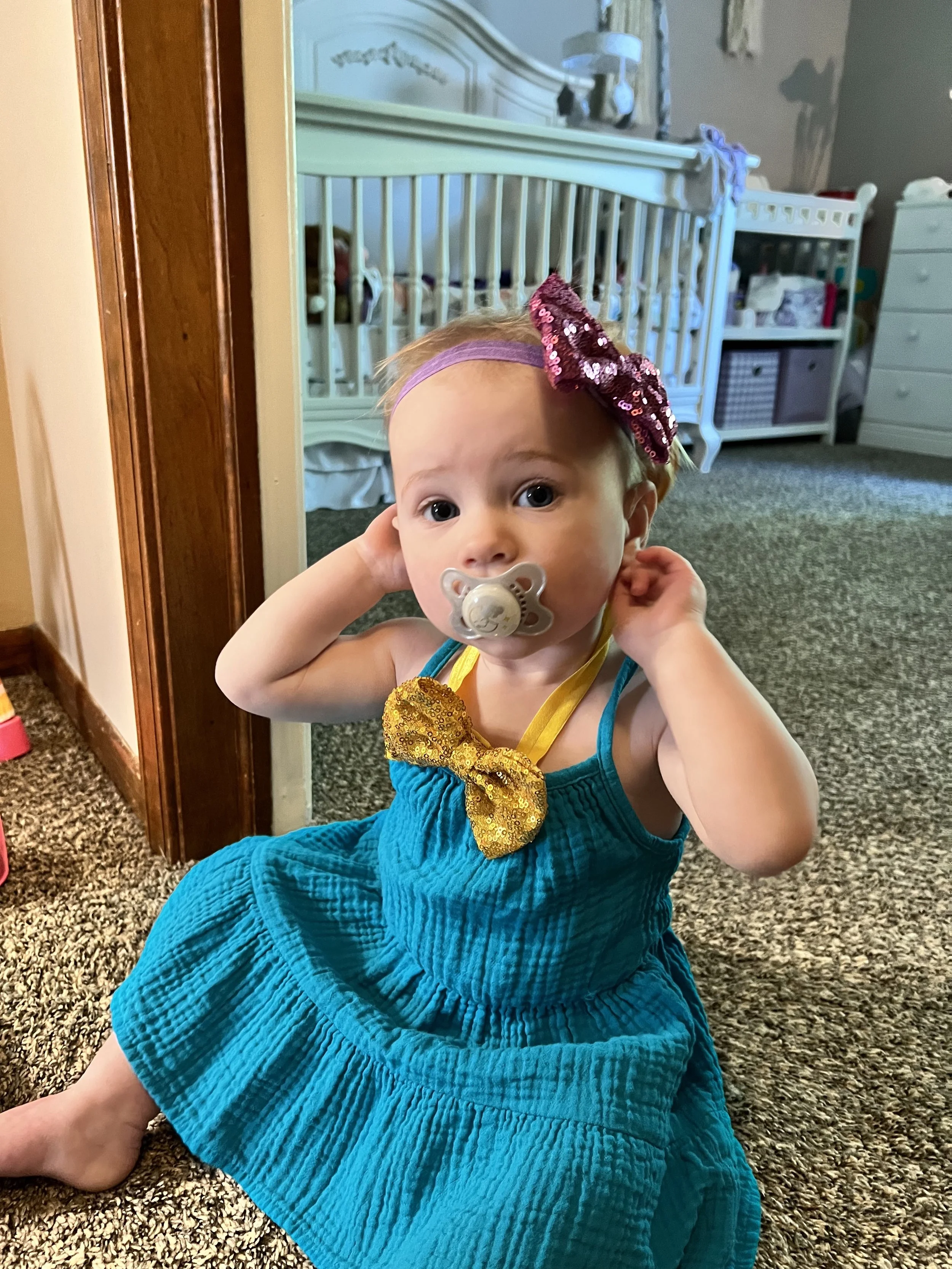 Currently, Lyla enjoys turning the TV on, making pillow forts with Daddy, and is obsessed with Mickey’s Clubhouse and Cocomelon! If she hears the theme song from Mickey, she will start dancing immediately. When she’s not watching her favorite shows, Lyla spends her time throwing her toys down the stairs and outside of the tub. She also has a real knack for getting past all the baby-proofing locks daddy has put on the kitchen cabinets. If she wants something, she will get to it one way or another. The cabinet locks left just enough of a gap that Lyla could wiggle her tiny wrist through and pull things out. She’s also a mini hulk and used her strength to pull open the pantry door resulting in one of the locks breaking. Thankfully, we found some magnetic safety adhesives that have worked much better! I will link them here in case anyone is interested in getting some for their home! They’ve been a lifesaver!