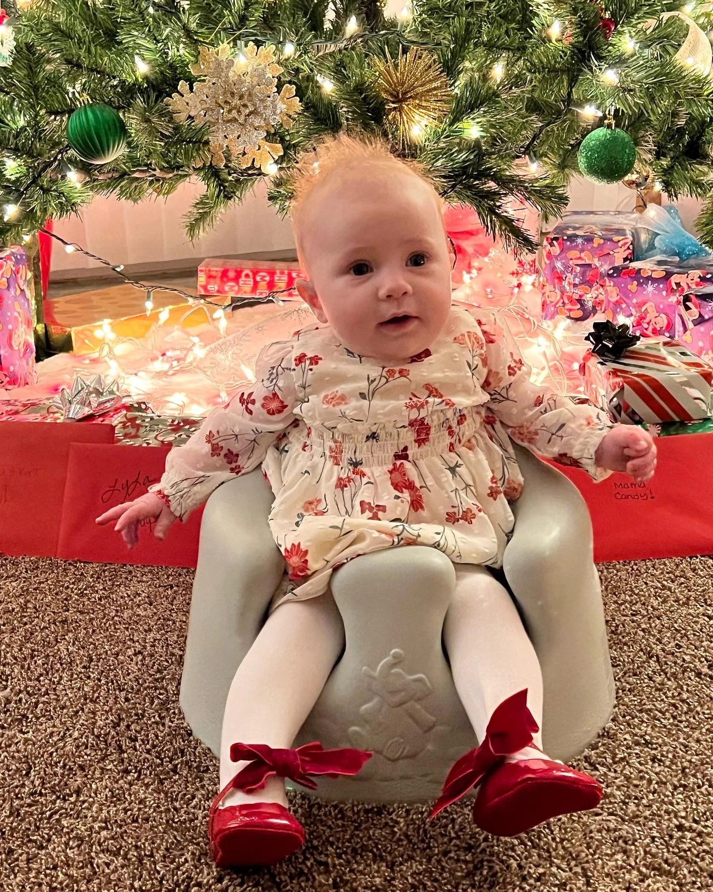 Month 5 was an exciting one! She celebrated her first Christmas and I have to say, Christmas with a little one—there’s nothing like it. It made the holidays feel ten times more magical and I loved seeing Christmas through her eyes. Having a child is like the gift that keeps on giving. Every time she learns something new, I get so excited! She received a bell from Grandma Maureen this month and it has been one of her favorite toys to date. She found great pleasure in shaking it while grandma sang Jingle Bells. I say it every month, but the girl loves her music. One of the highlights of the holiday season was taking her through a drive thru light show. Her eyes were so big looking at all the colors and lights. We also took her to meet Santa for the very first time and she did amazing! She didn’t shed any tears. On Christmas Eve, we spent part of the evening with Grandma Maureen and the other half with Grandma Linda. Lyla was so excited she slept through most of Christmas Eve service and all through gift opening ☺️.