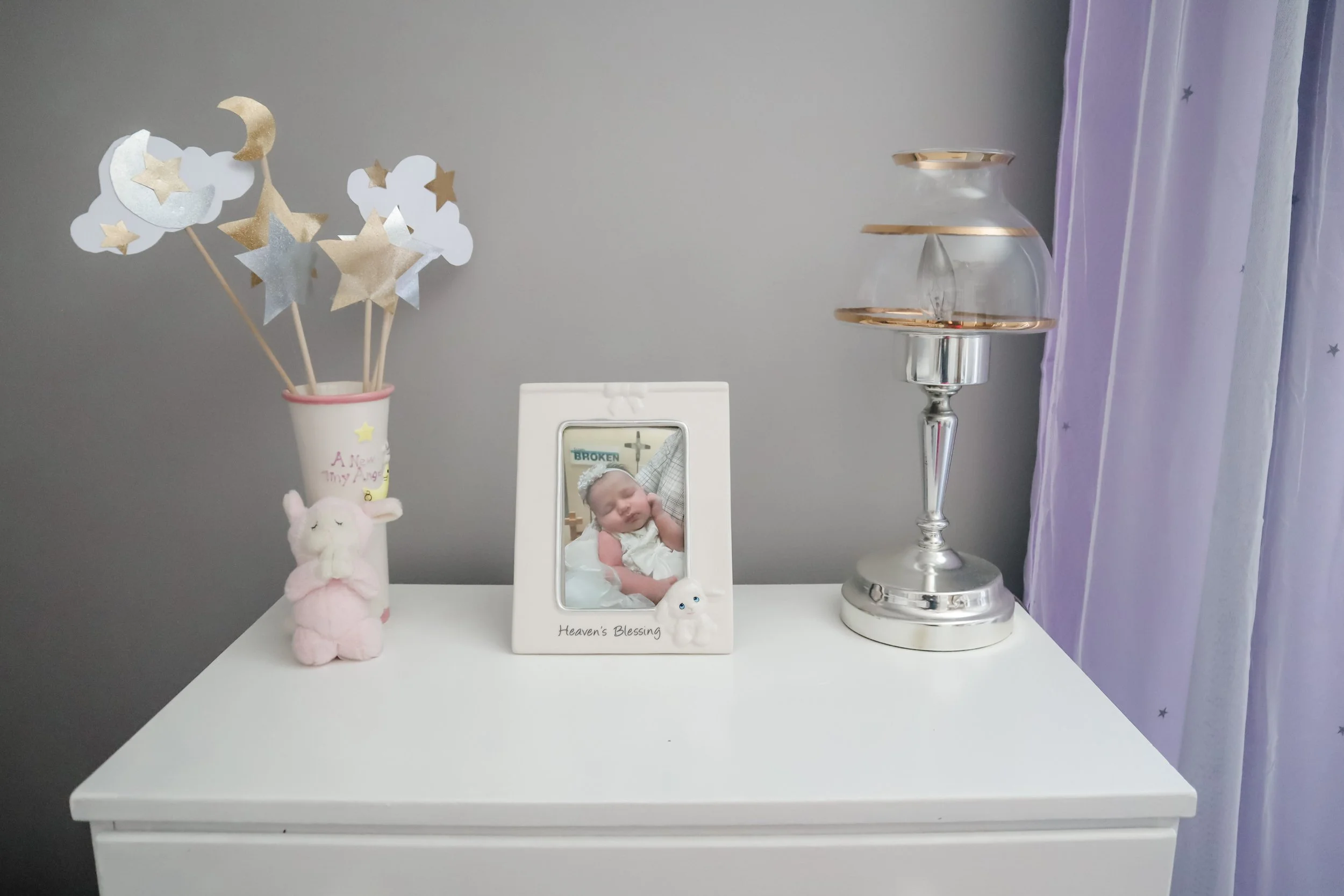 As for the other wall art, I got the star and moon tassels from Hobby Lobby along with the hanger rack! I also decided to hang her birth announcement sign with a crocheted cross one of Kent’s customers made for her. Since these were smaller items, I hung them on a smaller wall near her closet. The last thing we hung on the wall was a bow and headband organizer. I might have gone a little crazy with the bows, but at least Lyla will always have a bow to match any outfit! Haha. We put this behind her door so it didn’t take away from her theme. Another little knick knack that I put on her dresser was the “tiny little angel” vase. This belonged to her cousin Hayley. I gave it a little refresh by creating some star/moon picks to put in it.