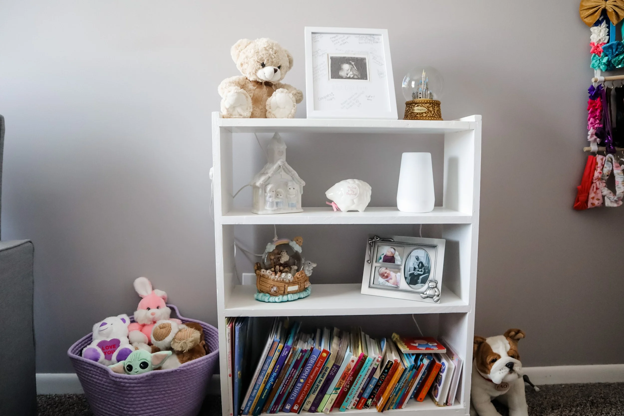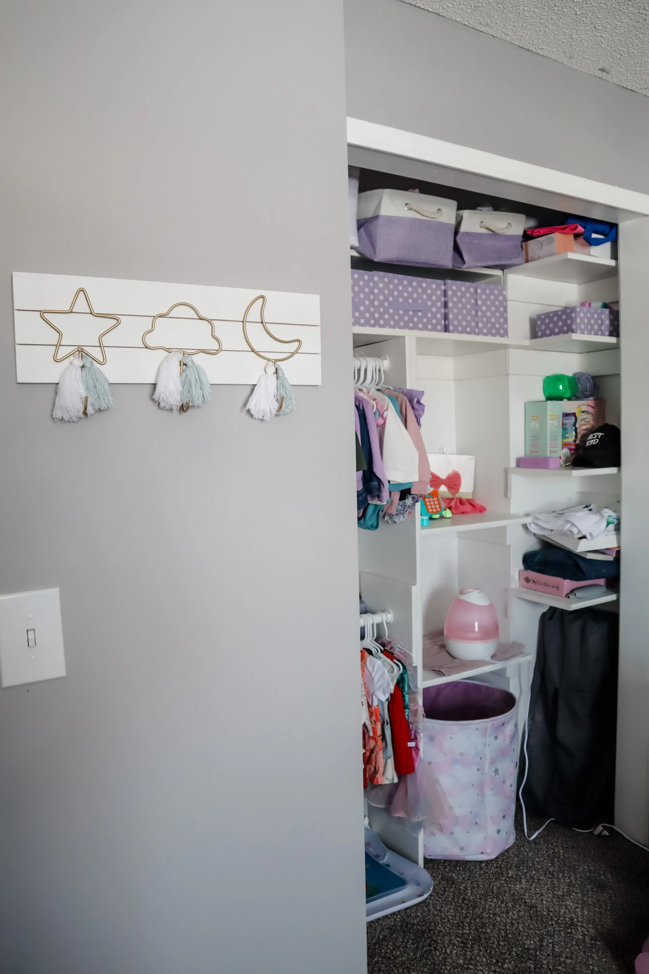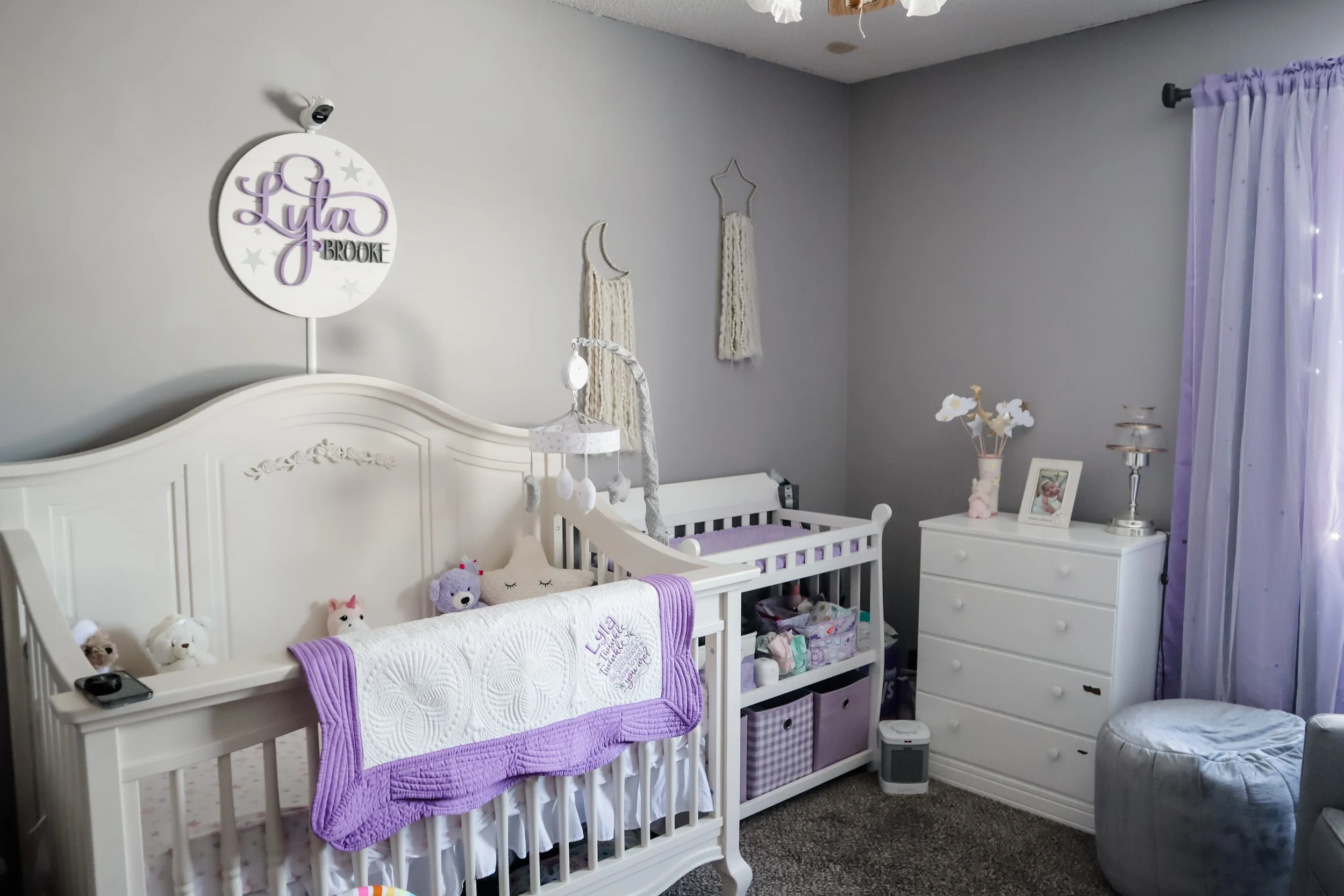 When we moved into our house, we knew that room would eventually become a nursery and so we painted it a light gray (Essential Gray from Sherwin Williams). I wanted something neutral that I could build a theme around. For the color scheme, I knew I wanted to incorporate lavender instead of traditional pink. I decided on lavender and gray with hints of gold sprinkled throughout. For the furniture, I stuck to mostly white since we had received a white dresser and bookshelf from Kent’s mom that she was no longer using. The only thing that wasn’t white was the glider we purchased. We went with a light gray option because I figured if we spilled anything on it, it’d be a little easier to clean than a white/cream color.