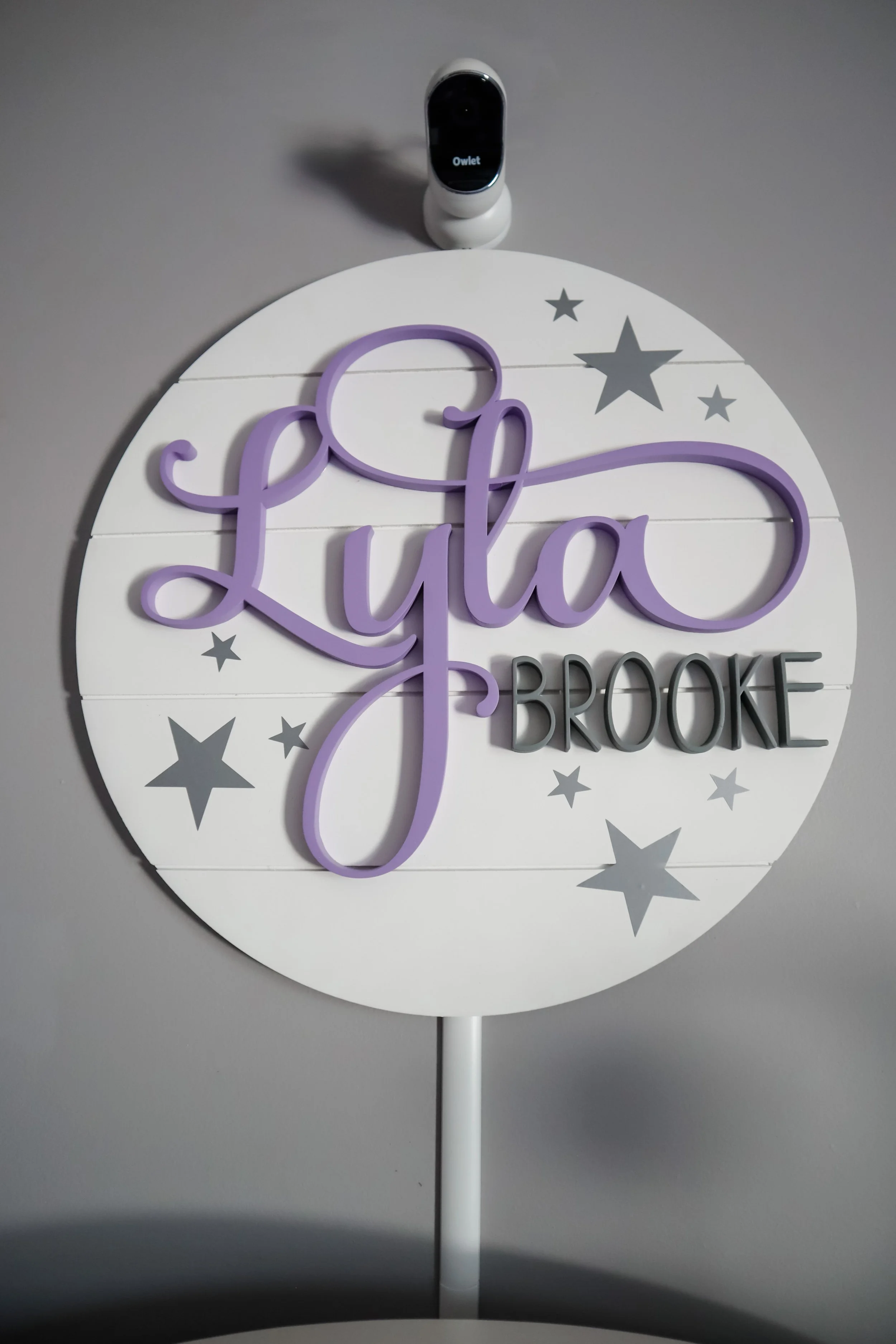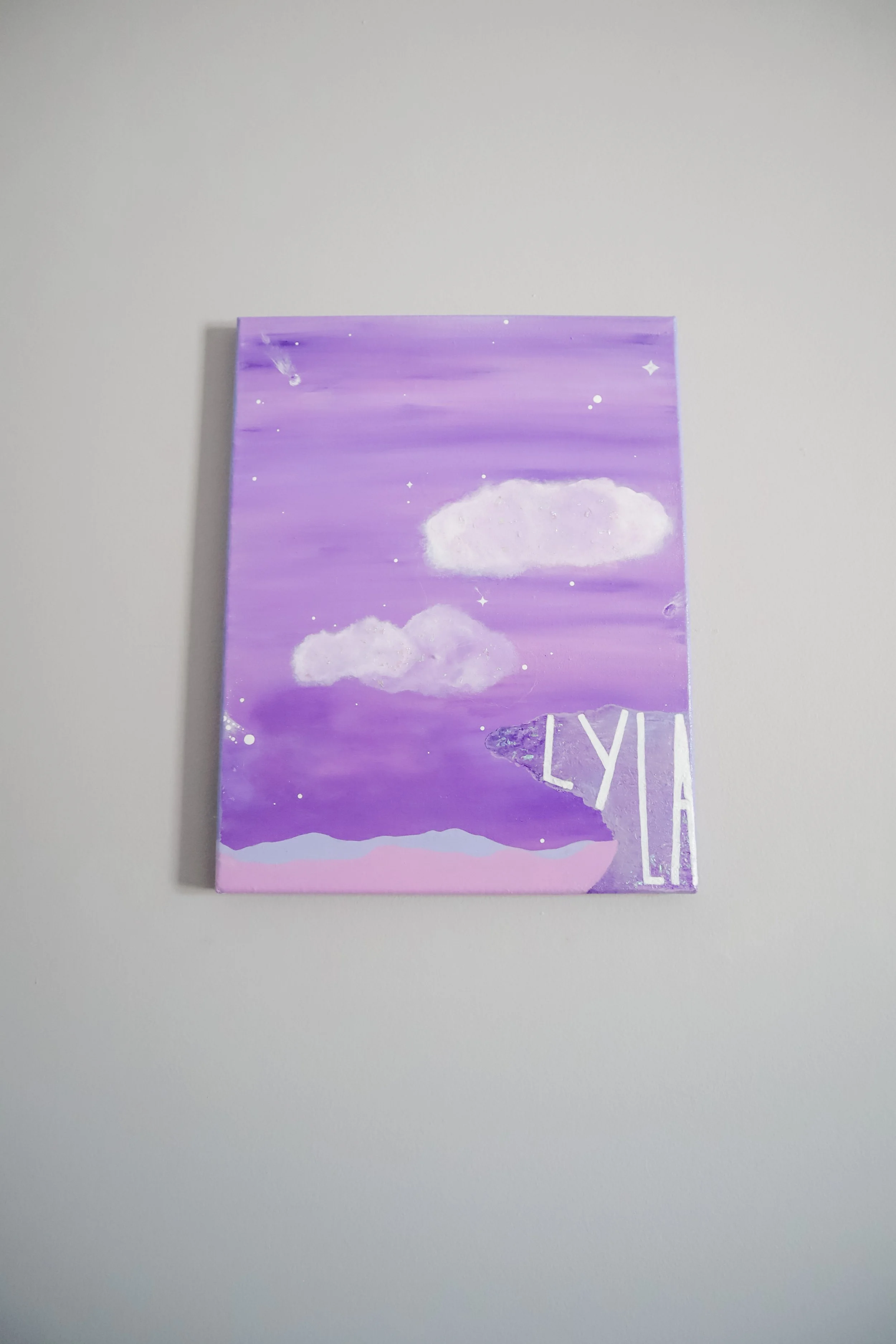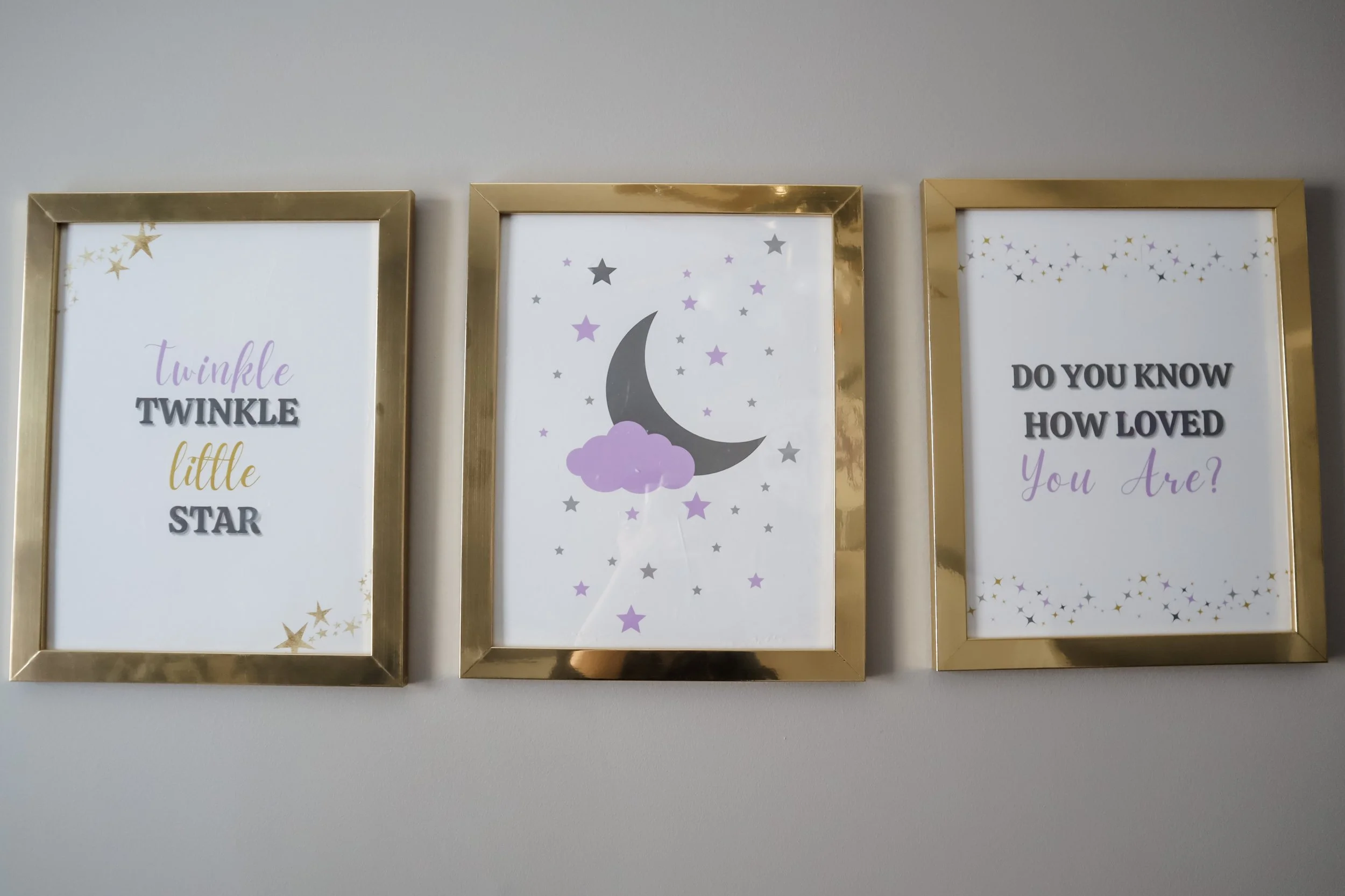 Now, for the actual room decor is where I really got to have some fun! As I mentioned earlier, the sign that I saw in the furniture store is what inspired the theme. I wanted to find something similar and so I hopped online and found lots of options. The only problem was everything I found didn’t match my color scheme. So, I decided to recreate the prints using Canva and I loved how they turned out! I printed them at Walgreens and then bought some gold frames from Michaels to put them in. Not only did I get to have complete creative control, but it also saved me money too! Speaking of prints, the other print in Lyla’s room was painted by her cousin Hayley! My one splurge for the decor was her name sign. I’ll link the Etsy shop I purchased it from. They did a phenomenal job! After the sign came, I went in and added some silver star stickers I purchased off Amazon to give it a little extra “sparkle”.
