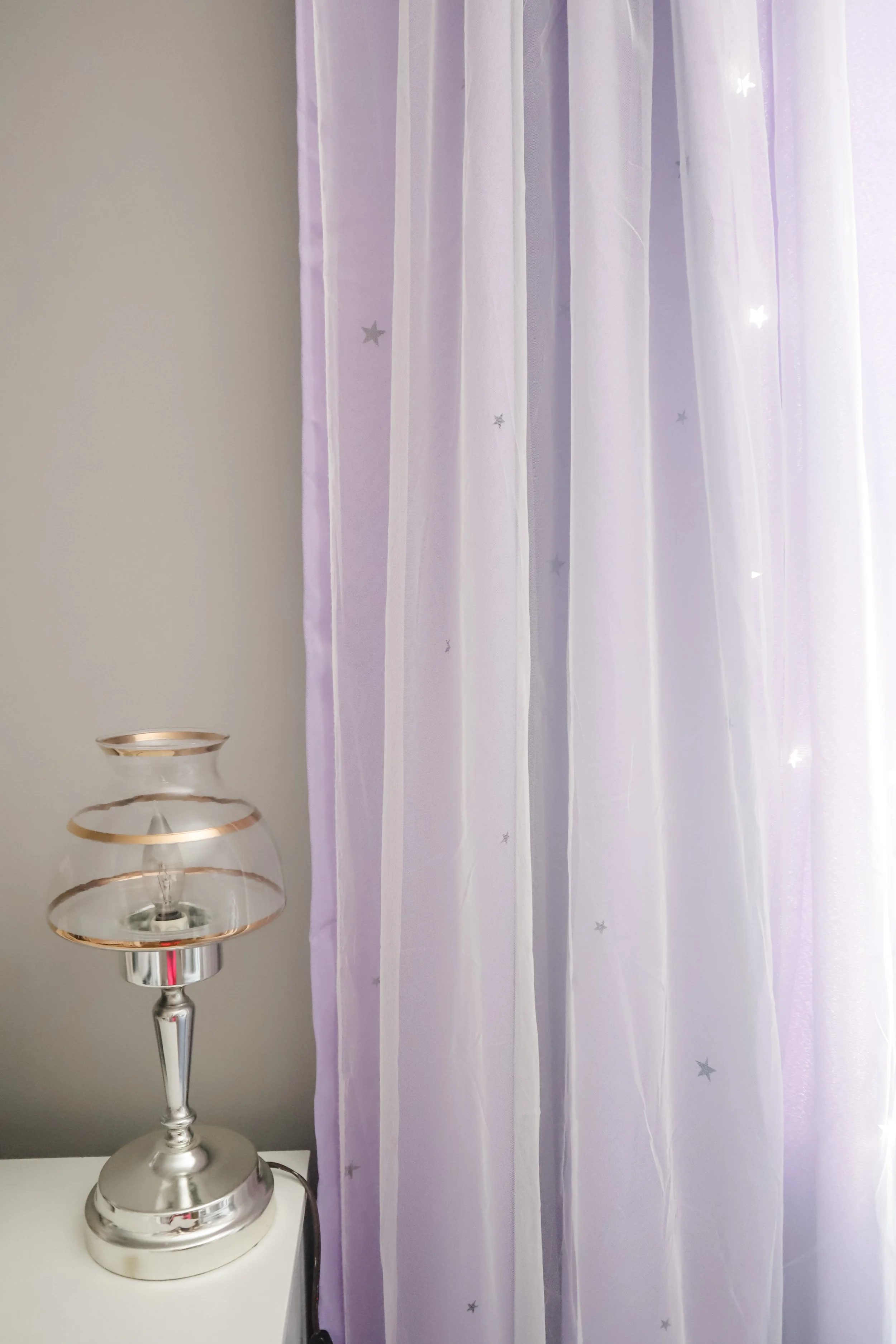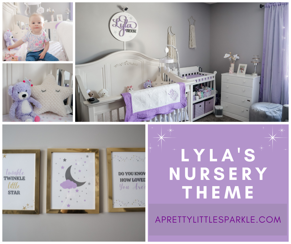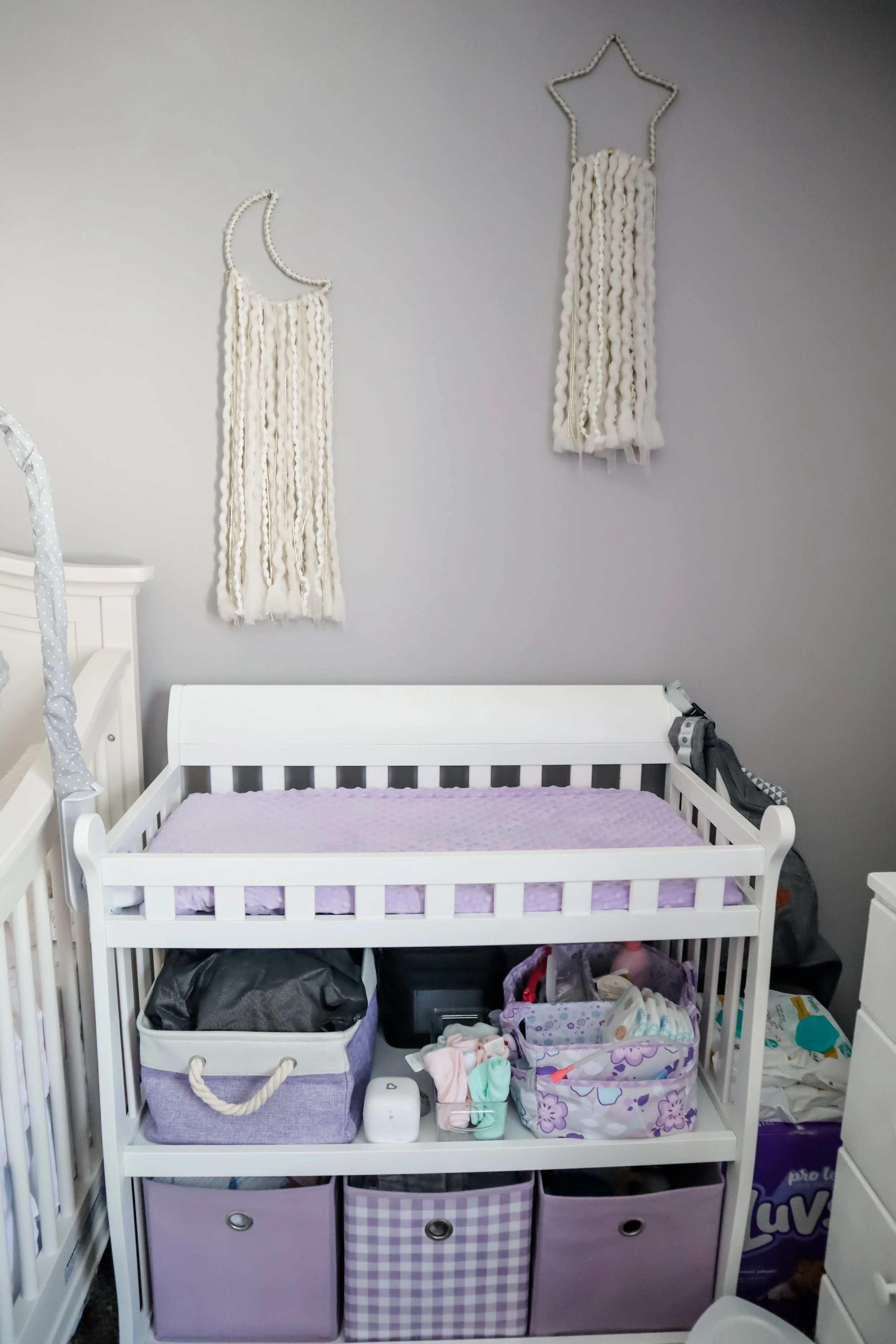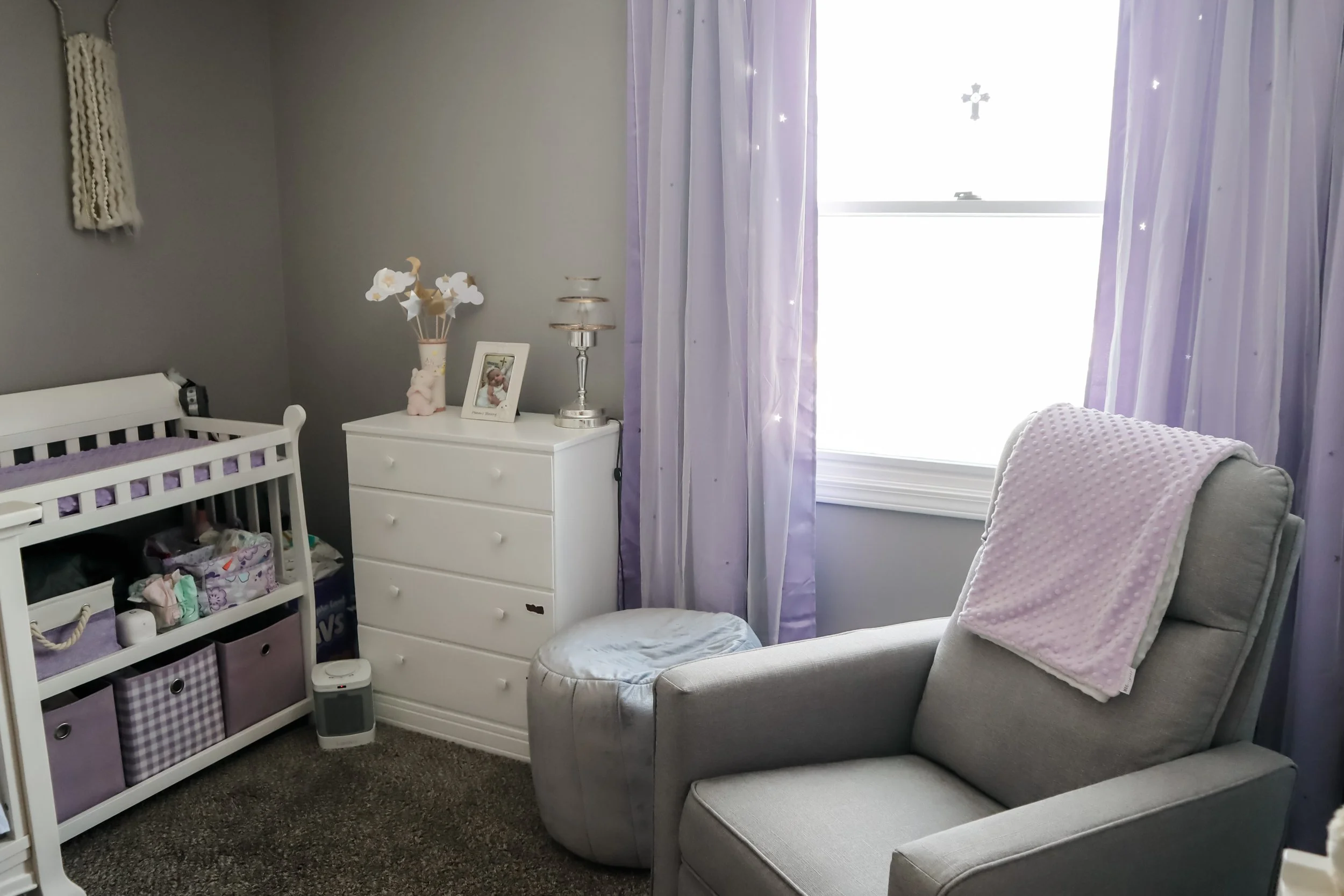 Now to make the lavender pop in her room, I decided to buy all her storage bins/baskets in the lavender color. Some of these are under her changing table and the rest are in her closet. I also found a lavender cover for her changing table too. My favorite lavender item in her room though is her curtains! These were a steal! What made them even more perfect was they had small start cutouts in them so when the sun sets you can see the reflections on her wall. Adding these really tied her theme together and made her room feel magical. My mother also purchased a lavender baby blanket for her that I put over the glider when we aren’t using it.