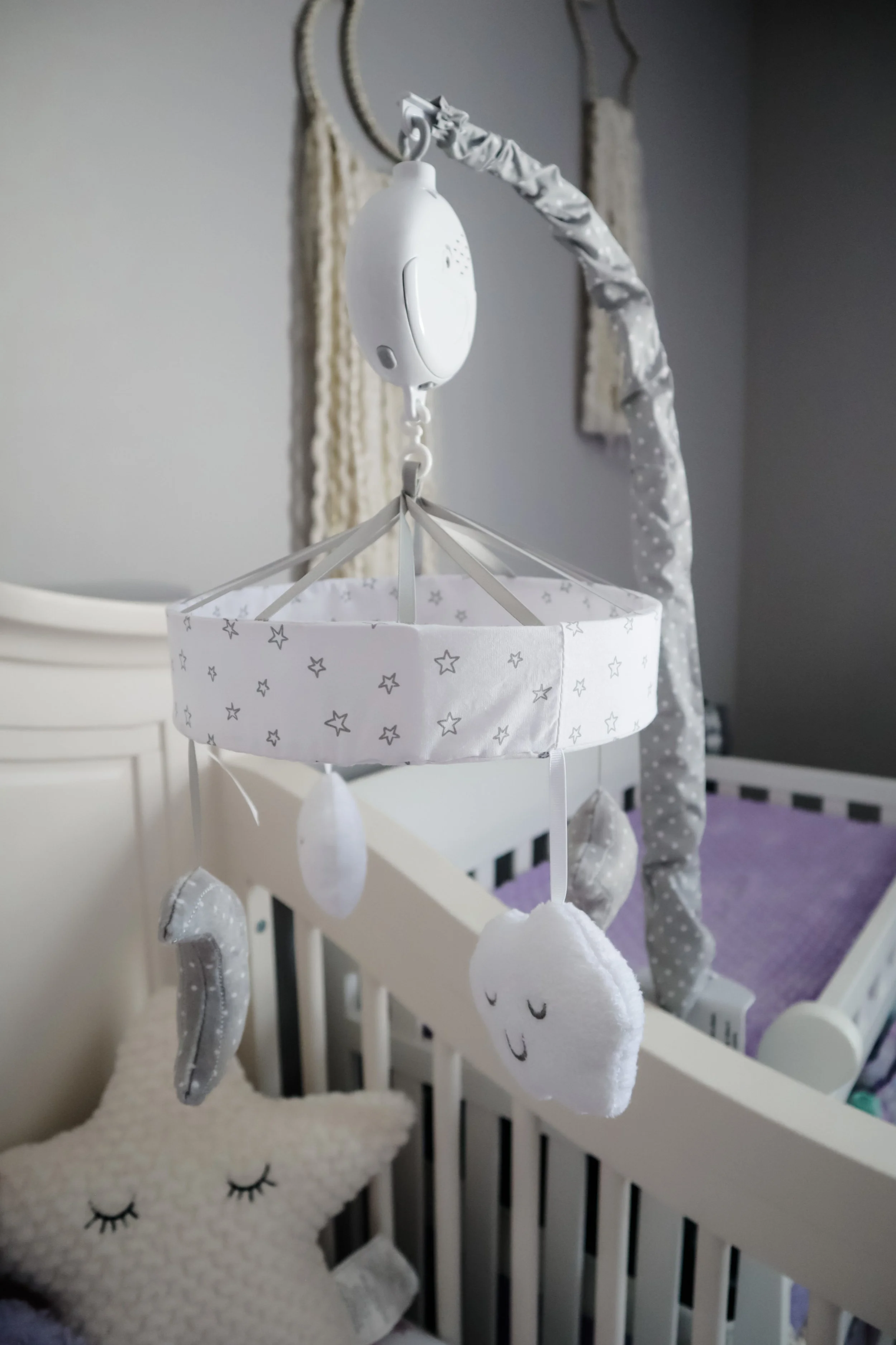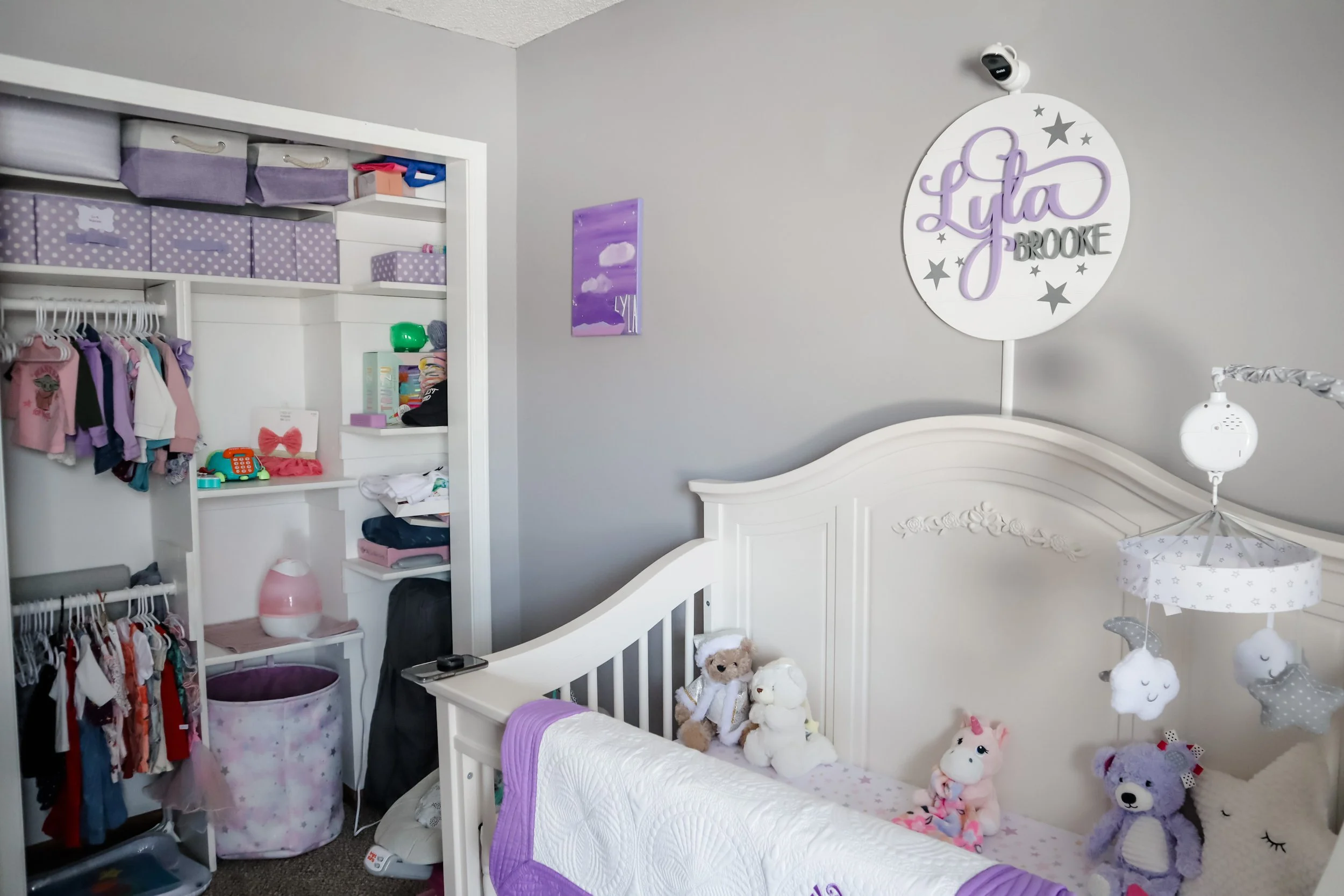 Last, but certainly not least was her crib! Kent’s mom was gracious enough to pay for her beautiful crib. I knew instantly when I saw it, it was the one. It has more of an off-white color compared to some of the other furniture in her room but doesn’t look out of place in my opinion. To incorporate the theme into the crib, I purchased some star-printed sheets. They just happened to fit with her color scheme so that was an added bonus! I also purchased a personalized quilt to put over the side of the crib that has her name and the quote that I made prints of. I was also able to find a crib mobile that had stars and moons on it. To top it off, I found a star plush pillow at Hobby Lobby that I placed in the crib along with a lavender teddy bear I found at Target.