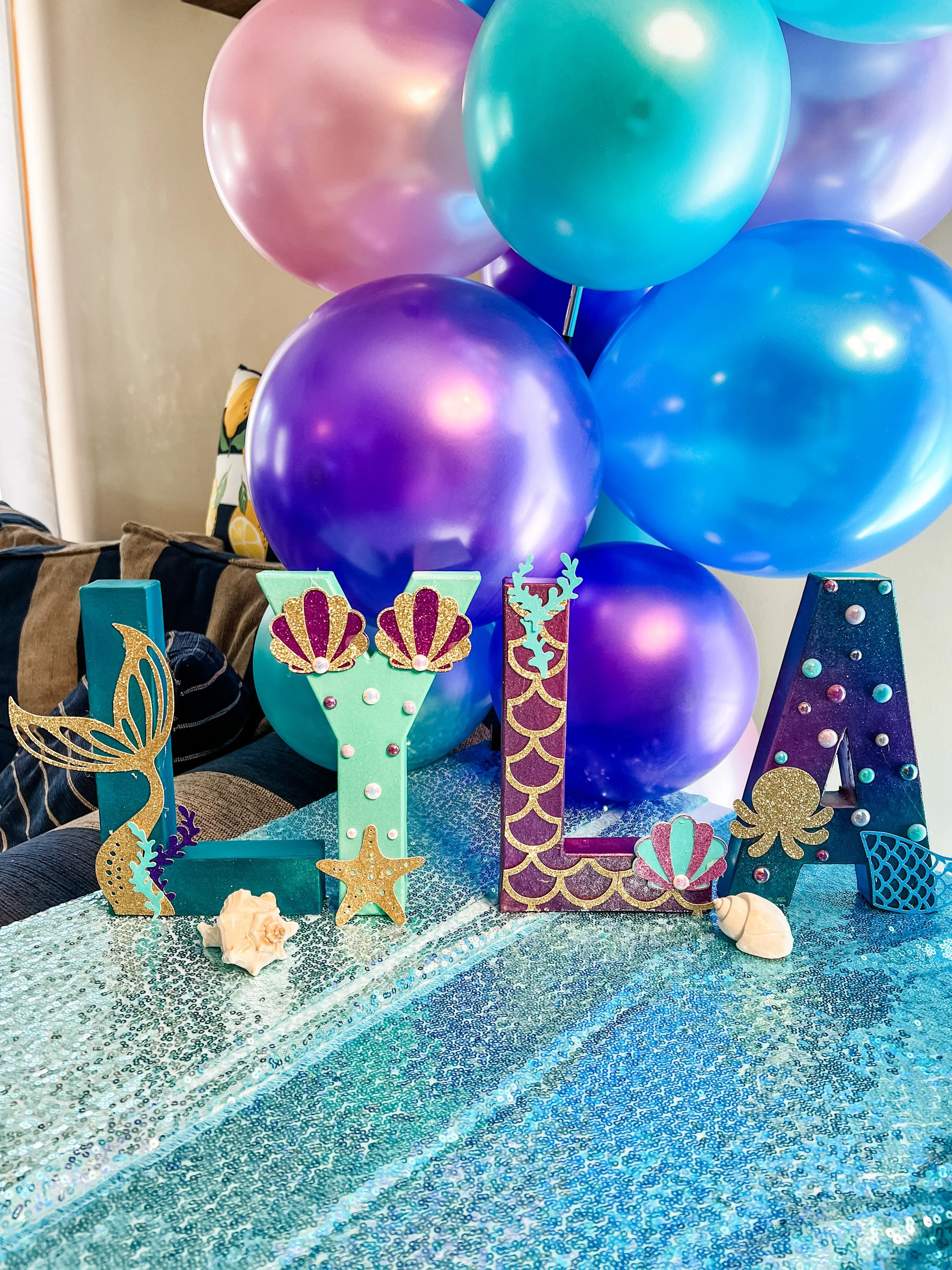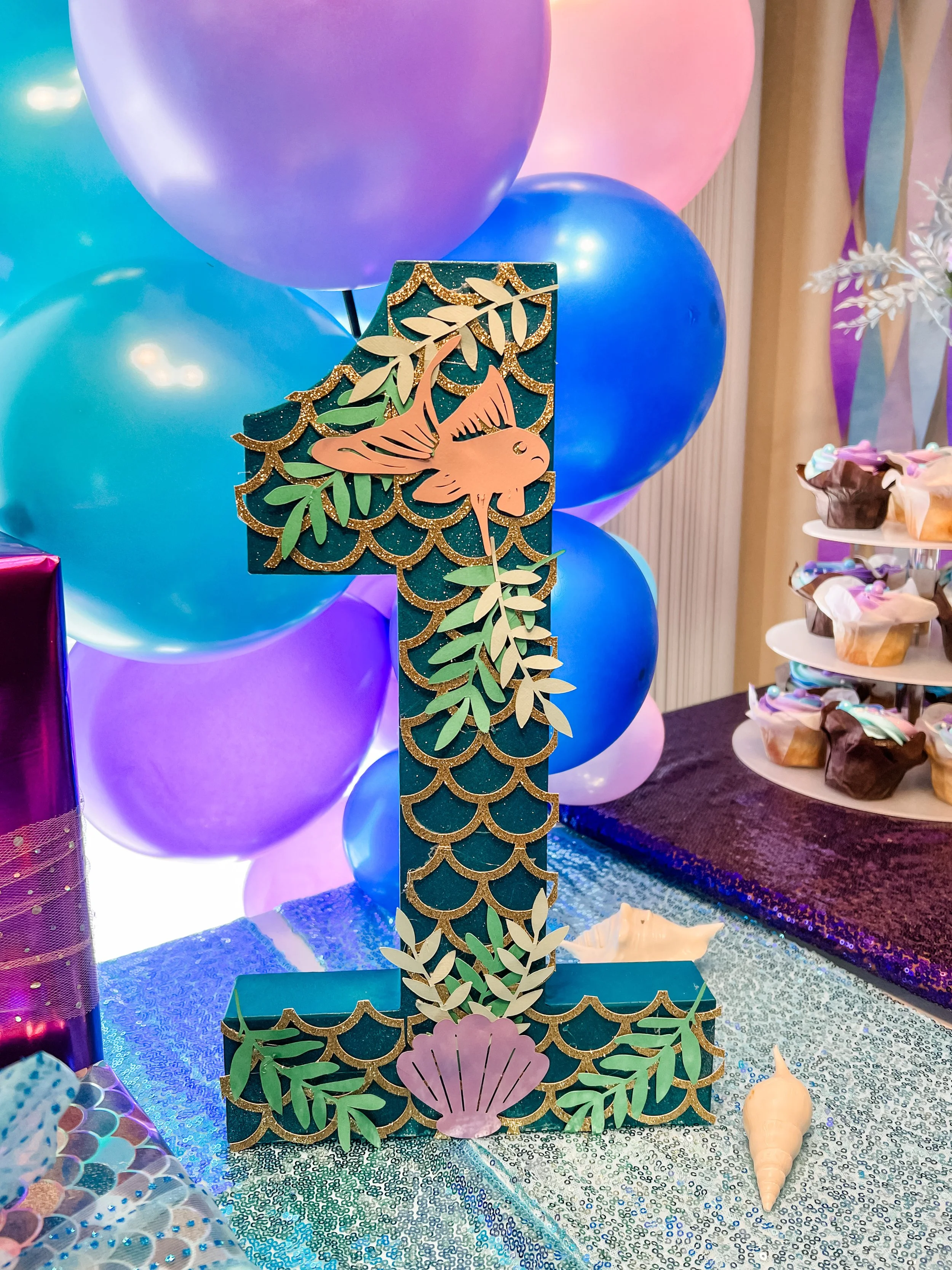 So, let’s talk about decorations. I’ll just come right out and say that my Cricut was used A LOT! It was seriously a lifesaver when bringing my ideas to life. For her paper mache 1 and letters, I spray painted them and added a layer of glitter. Once they were dry, I used the Cricut to create intricate mermaid and sea life designs. These were probably my favorite decorations that I made. It took a lot of work, but the outcome made every minute worth it!