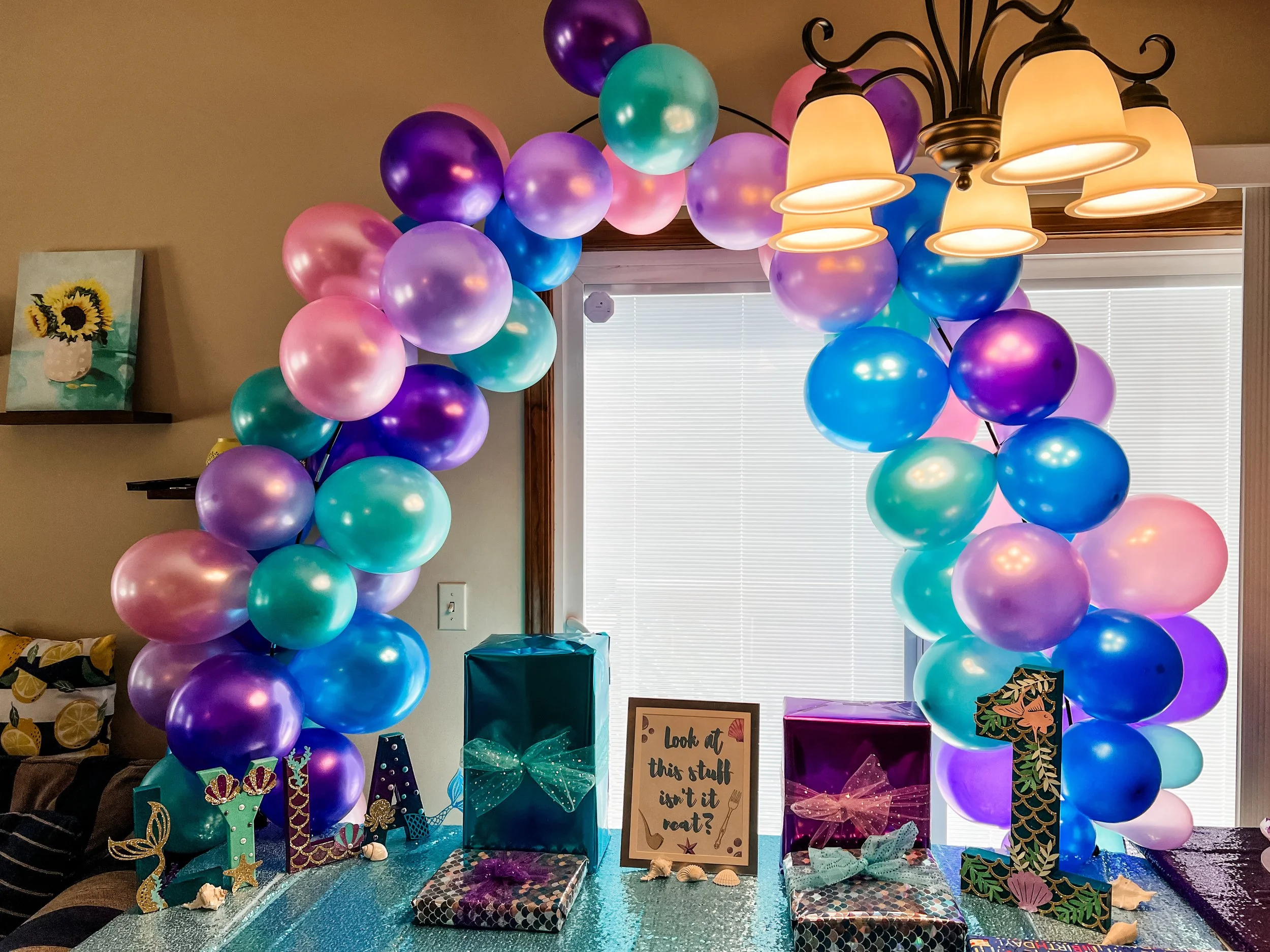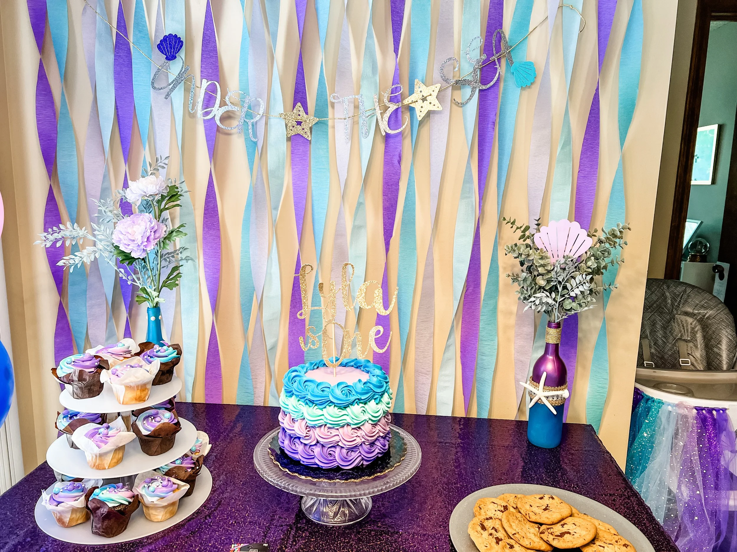 I also used the Cricut to create her banner, cake topper, and first-year garland. Behind her banner, I taped up streamers to create a pretty backdrop for the dessert table. For the tabletop decor, I took wine bottles, spray painted them, and then used twine, rhinestones, and a few other materials to decorate them so I could use them as vases. On the gift table, I also put a sign I made on Canva as a nod to The Little Mermaid song. We also did a balloon arch over the gift table, which was fun but way too big for our tiny dining room :). I purchased some fake seashells and scattered them around the table, too. For her high chair banner, I bought some sparkly tulle in the colors that matched her theme and followed an easy tutorial on YouTube.